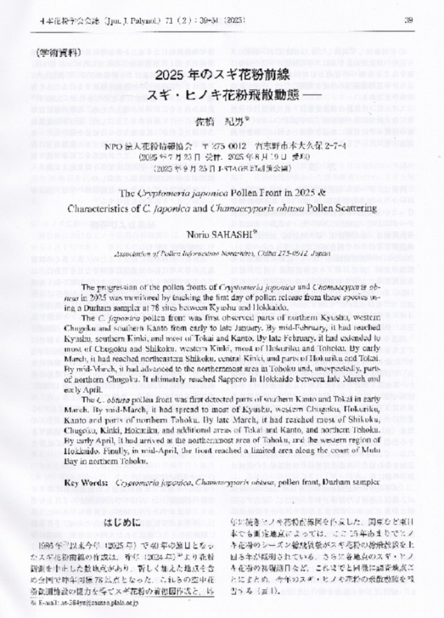 今年も、スギ花粉前線として、日本花粉学会会誌に学術資料としてまとめられました。