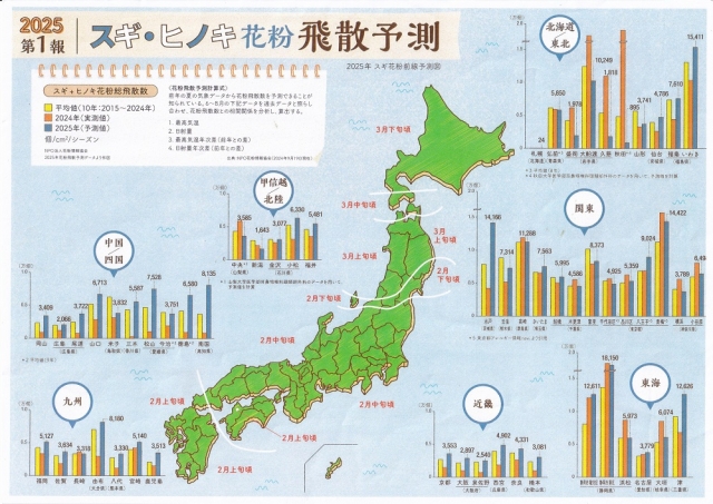 2025年の広島県のスギ花粉飛散予測は、昨年に比べ「多い(150~200%)」、および、10年平均に比べ「非常に多い(200%以上)」の飛散量であり、飛散開始日は2/15頃と発表されました(日本気象協会 第2報2024.12.7より)。