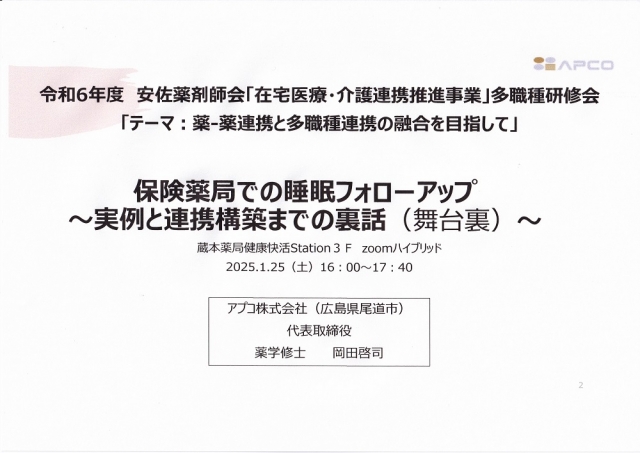 「安佐薬剤師会 ”在宅医療・介護連携推進事業” 多職種研修会の演者」安佐薬剤師会「在宅医療・介護連携推進事業」多職種研修会において、睡眠衛生指導及び睡眠フォローアップ連携事業について、JA尾道総合病院様とアプコUnity薬局での試みと連携構築までの裏話の演題で講演してまいりました。