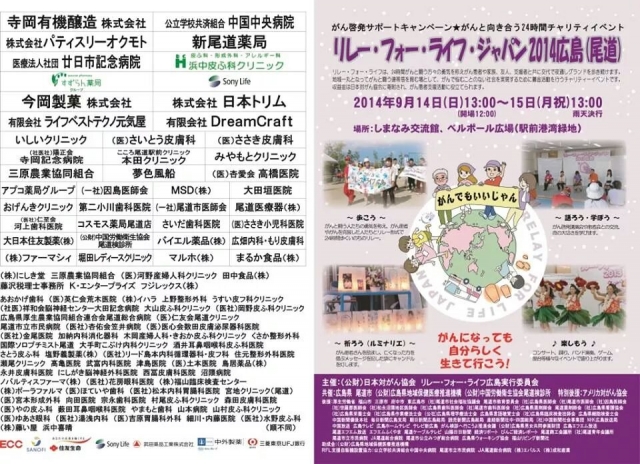 「リレー・フォー・ライフ・ジャパン 2014 in広島(尾道)」「リレーフォーライフ」は、24時間がんと闘う方々の勇気を称え、患者や家族、友人、支援者と共に交代で夜通しグランドを歩き続けます。地域一丸となってがんと闘う連帯感を育む場として、がんで悩む事のない社会を実現するために募金活動を行うチャリティーイベントです。