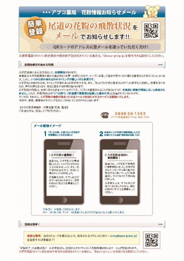 そこで、当薬局において実際に観測した花粉情報をいち早くお知らせすることで、受診(初期療法)や予防に役立てていただければと考えます。