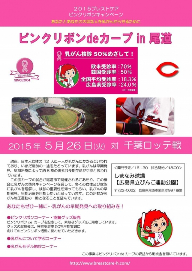 「ピンクリボンdeカープin尾道」現在、日本人女性の人12に1人が乳がんにかかるといわれており、いまだ増加の一途をたどっています。乳がんは早期発