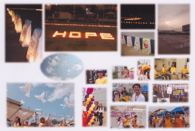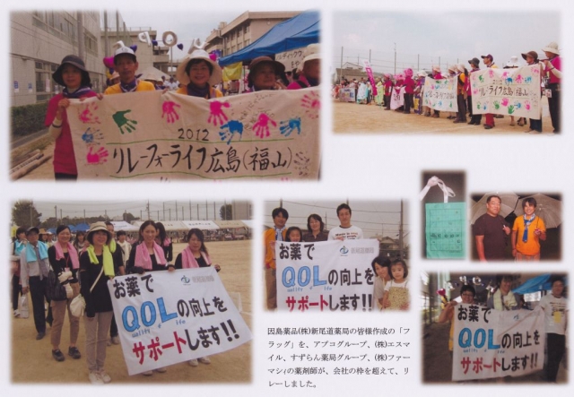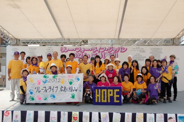 「リレー・フォー・ライフ・ジャパン 2012 in 広島(福山)」「リレーフォーライフ」は、24時間がんと闘う方々の勇気を称え患者や家族、友人、支援者と共に交代で夜通しグランドを歩き続けます。地域一丸となってがんと闘う連帯感を育む場として、がんで悩む事のない社会を実現するために募金活動を行うチャリティーイベントです。