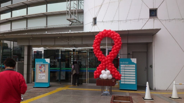 今回、エイズデーの象徴とされるレッドリボンを、バルーンアートの井脇様(夢色風船)、池本様(pokomoko)、石川様(まあちゃんの風船屋さん)に作成していただきました。