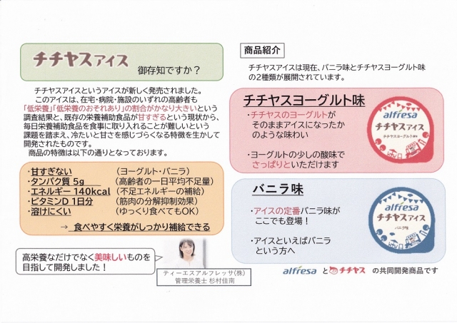 高栄養アイスは、ティーエスアルフレッサ株式会社とチチヤス株式会社との共同開発商品です。