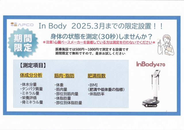 2025年1月14日から3月31日まで、InBody測定器を限定設置いたします。